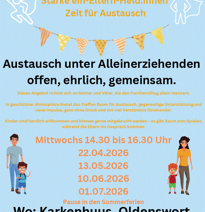 Alleinerziehenden Austausch in Oldenswort! von Lena_Foran | Juli 15, 2025 | News | 0 Kommentare Alleinerziehenden Austausch in Oldenswort!15.07.2025 Es ist Zeit für Austausch. In Oldenswort gibt es nun einen Alleinerziehenden-Austausch für „Starke Ein-Eltern-Held:innen“. Termine und Zeiten siehe Flyer.